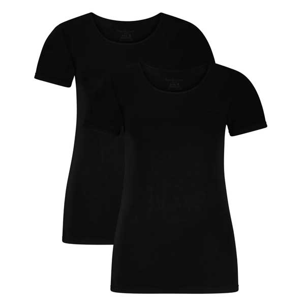 Bamboe shirt korte mouw kate Bamboo basics, 2 zwarte dames T-shirts met ronde hals. Mouwtjes tot halverwege de bovenarm, bamboe-blend met stretch. Bekijk de gehele collectie Bamboo basics.