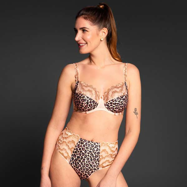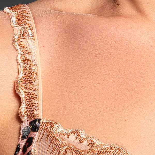 De ondercups zijn subtiel bedrukt met een stijlvolle dierenprint en vormen samen met het gouden borduursel een zeldzaam mooie combinatie. Draag deze BH samen met de bijpassende slip of taille-slip voor een complete set die luxe uitstraalt tot in elk detail.
