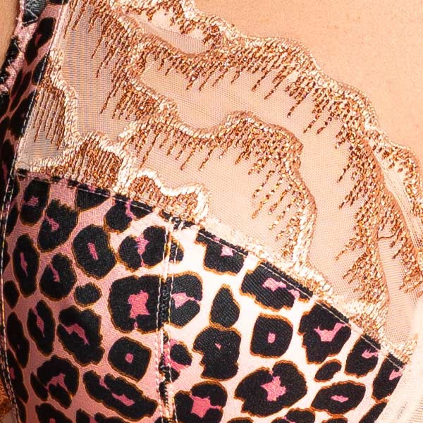 Deze BH van Louisa Bracq (model 546-01) is een absolute blikvanger voor wie houdt van luxe, detail en verfijning. Een unieke combinatie van dierenprint, goudaccenten en delicaat kant, afgewerkt in een zachte lichtroze perziktint.