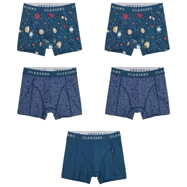 Claesens jongens boxershorts (5-pak) met een speelse sterren- en planetenprint. Gemaakt van zacht katoen met stretch voor een comfortabele pasvorm en prettig draagcomfort. Gehele aanbod Claesens / jongens ondergoed.
