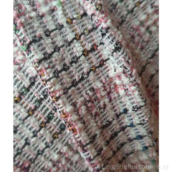 - De buitenstof is ruw geweven in verschillende kleurtinten met een klein subtiel glimmend draadje. De hoofdkleur is roze.