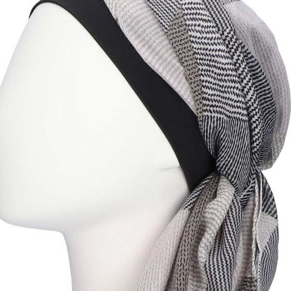 Dit model is ontworpen als voorgevormde chemo sjaal of alopecia sjaal. Het zwarte binnenmutsje vormt de basis en zorgt voor een aansluitende pasvorm, terwijl de vastgezette sjaal meer volume en een afgewerkte uitstraling geeft. Daardoor is dit type model prettig voor vrouwen die liever een kant-en-klaar sjaalmutsje dragen met wat meer vorm rond het hoofd.