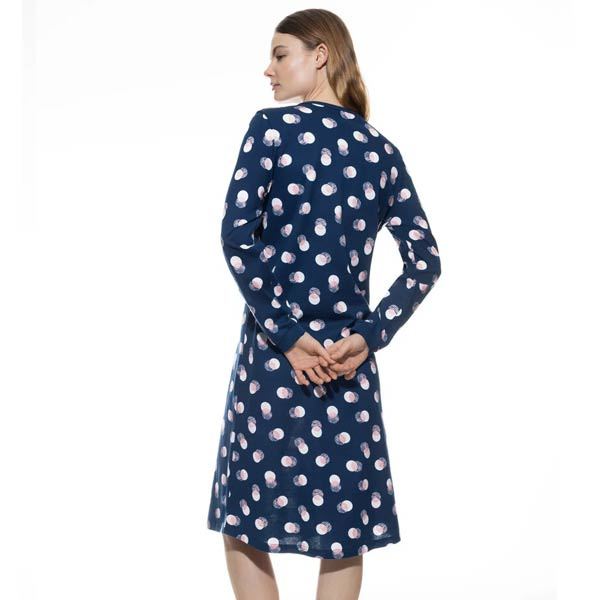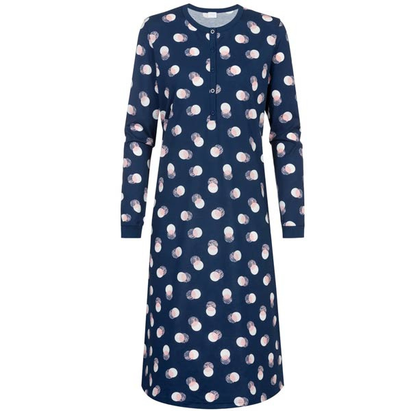 Dit Mey katoenen nachthemd uit de serie Scribbled Dots in de kleur Deep Marine is een fijne keuze voor wie houdt van comfortabele nachtkleding. Het nachthemd heeft lange mouwen met boorden, een knoopsluiting bij de ronde hals en een casual pasvorm. Gemaakt van 100% katoen (single jersey) en OEKO-TEX Standard 100 gecertificeerd. Extra mooi: er zit nu een leuke korting op.
