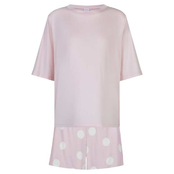 Deze Mey shortama uit de serie Pretty Dots is gemaakt van een soepele modal katoen mix van 50% modal en 50% katoen. Door de lichte, dunne en zachte interlockkwaliteit is dit een fijne keuze als shortama voor warmere nachten of als u snel warm bent. Het model bestaat uit een losvallend shirt met korte mouwen en een korte broek met stippenprint, en valt binnen onze collectie pyjama’s en nachtkleding. Een prettige zomer pyjama voor wie zachte, ademende stoffen zoekt.