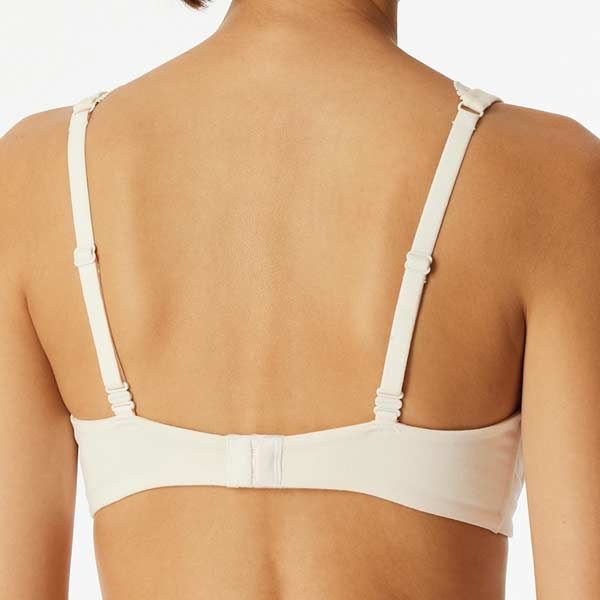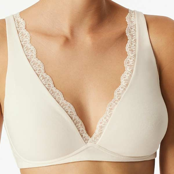Schiesser 183241 beugelloze bh in off-white uit de Unique Cotton lijn. De cups hebben een dubbele laag zacht katoen en zijn mooi glad. met een subtiele kant bies langs het decolleté. Gemaakt met 720° Stretch™ op basis van biologisch katoen voor soepel draagcomfort, elke dag.