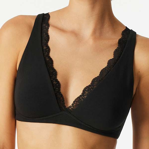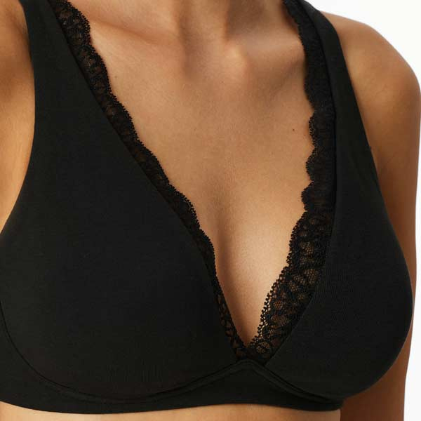 Schiesser bh zonder beugel katoen 183241 van biologisch katoen met een klein zacht sierrandje langs de cup van kant. De bandjes izjn op meerdere manier te dragen. Gehele aanbod katoenen bh / Schiesser.