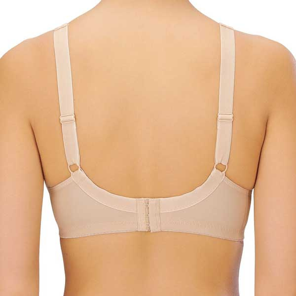 De brede verstelbare schouderbandjes zijn licht gevoerd en kunnen aangepast worden voor een goede pasvorm. Door de breedte verdelen de bandjes de druk over de schouders. Aan de achterkant heeft de bh een brede haak-oog sluiting met meerdere standen. Dit maakt het mogelijk om de omvang aan te passen. De rug is glad afgewerkt, waardoor de bh onder kleding minder zichtbaar is.
