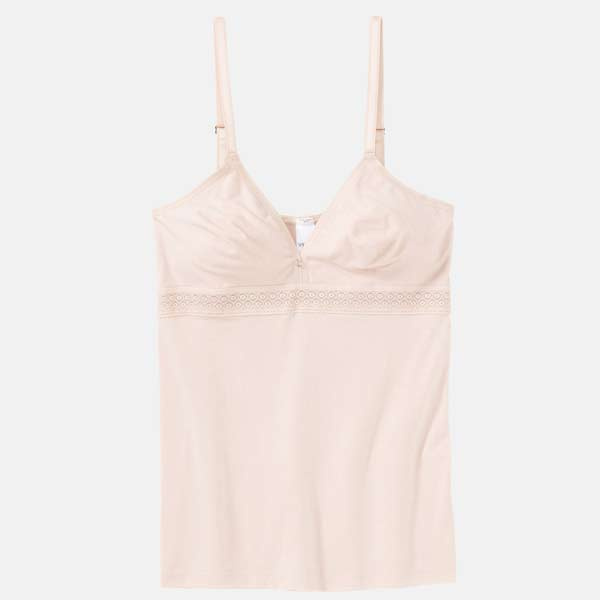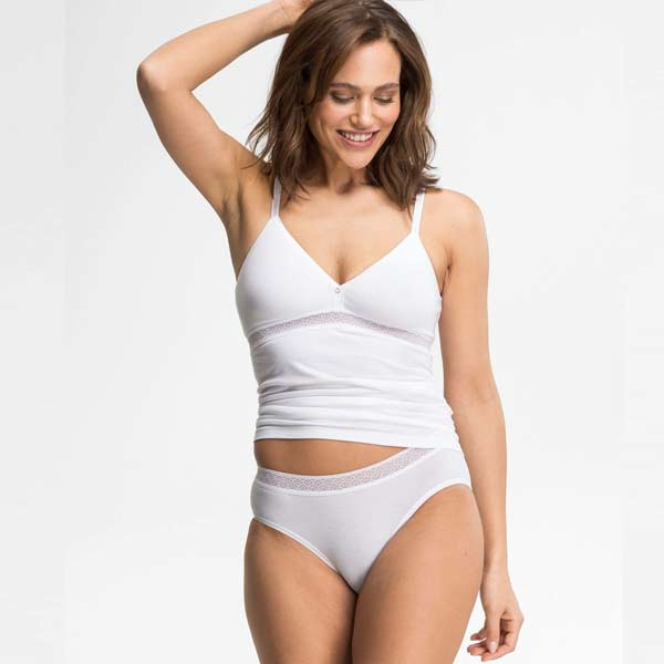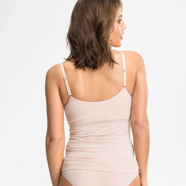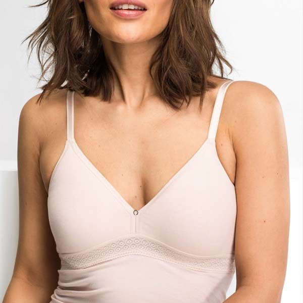 De cups zijn niet padded (zonder vulling) en geven een natuurlijke vorm. Onder de borst zit een grafisch kanten band. De bandjes zijn verstelbaar en het bh-hemd trekt u over het hoofd aan (geen sluiting op de rug). Door de gladde afwerking is het hemd bedoeld om onder kleding rustig te vallen.