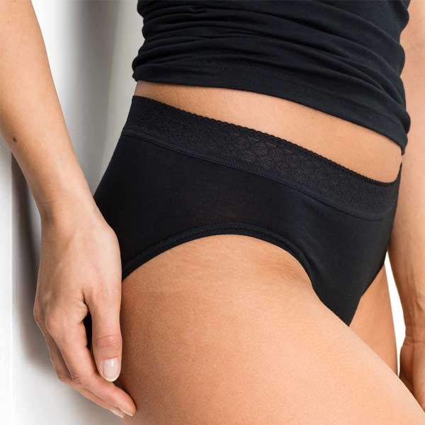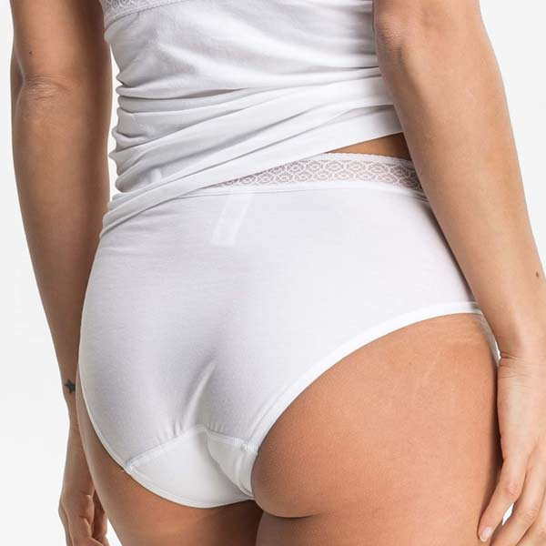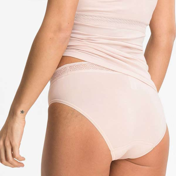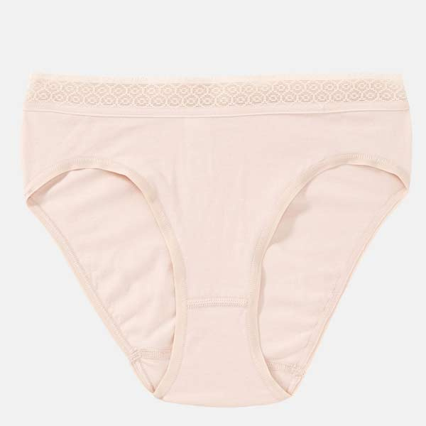 In de taille zit een grafische kanten band. De beenopeningen zijn afgewerkt met vlakke, matte randen, wat helpt om de slip minder te laten aftekenen. De bikinislip heeft geen storende zijnaden, wat prettig kan zijn wanneer u gevoelig bent voor naden aan de zijkant.