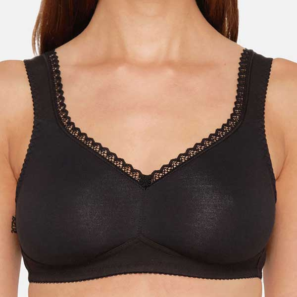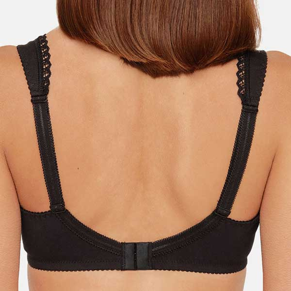De bh heeft een licht transparant effect in delen van het materiaal, wat het model optisch wat lichter maakt. De onderzijde is iets langer uitgevoerd, waardoor de bh extra steun en omsluiting biedt. In combinatie met de entlastingsrug en de bredere bandjes is dit een functionele beha zonder beugel voor wie waarde hecht aan katoen, ondersteuning en een beugelloos model.