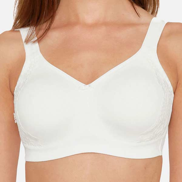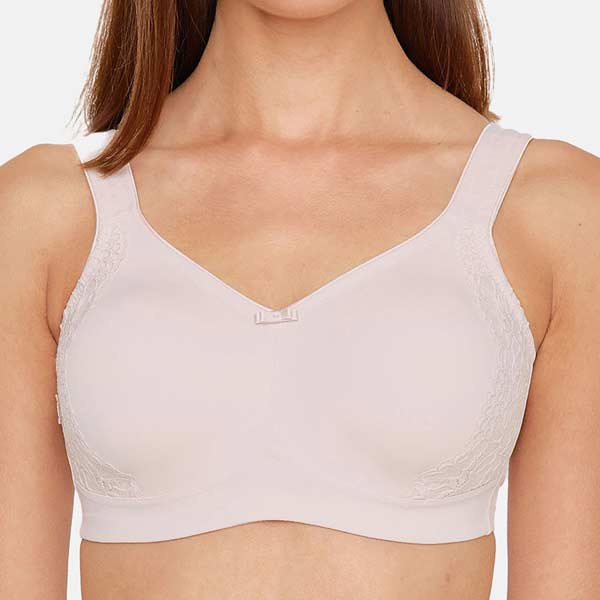 De brede schouderbanden helpen om de druk beter over de schouders te verdelen. Dit vermindert de kans op knelling en insnijden. Het zachte, soepele materiaal sluit goed aan op het lichaam en de subtiele kantafwerking geeft de bh een minder glad basisuiterlijk, zonder dat de cupconstructie grof wordt.
