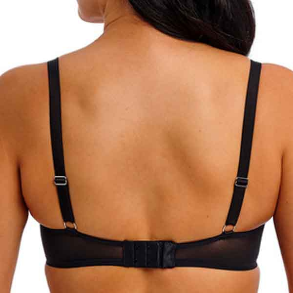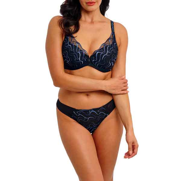 De cups zijn gemaakt van ultralichte, zachte vulling die de buste lift zonder zwaar aan te voelen. De zwarte basis is versierd met meerkleurig blauw borduurwerk in een golvend, geometrisch patroon, wat de bh een luxe en moderne uitstraling geeft. Stevige powermesh zij- en rugpanden sluiten mooi aan op het lichaam en geven extra steun, terwijl de volledig verstelbare bandjes en haaksluiting zorgen voor een persoonlijke pasvorm.