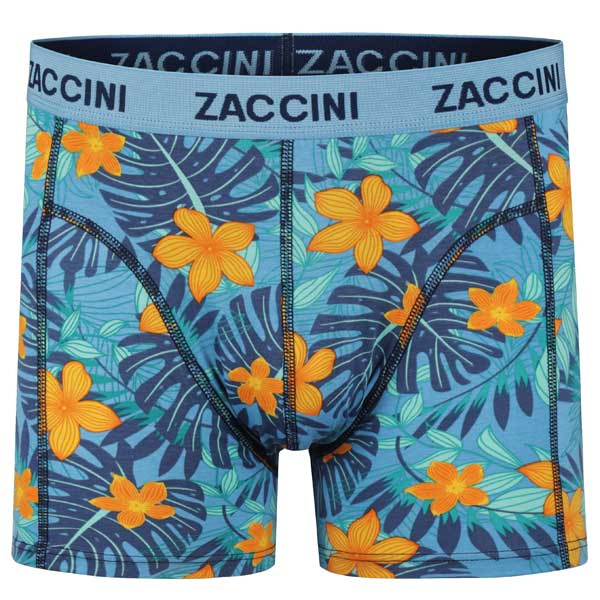 Zaccini underwear boxershorts Tropical Flower M25-277-03 een 2-pack heren boxershorts in blauwe kleuren, 1x effen donker blauw + 1x lichtere blauw met bloemen print in de bekende Zaccini pasvorm. Gehele aanbod Zaccini boxershorts.